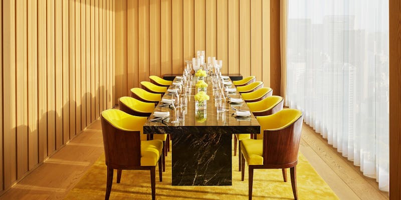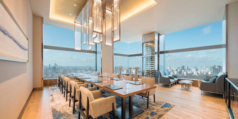 永田町駅直結のザ・プリンスギャラリー 東京紀尾井町内35F「WASHOKU 蒼天」。東京都内の景色を一望できる開放的な個室は華やかな食事会を豪華に彩ります。